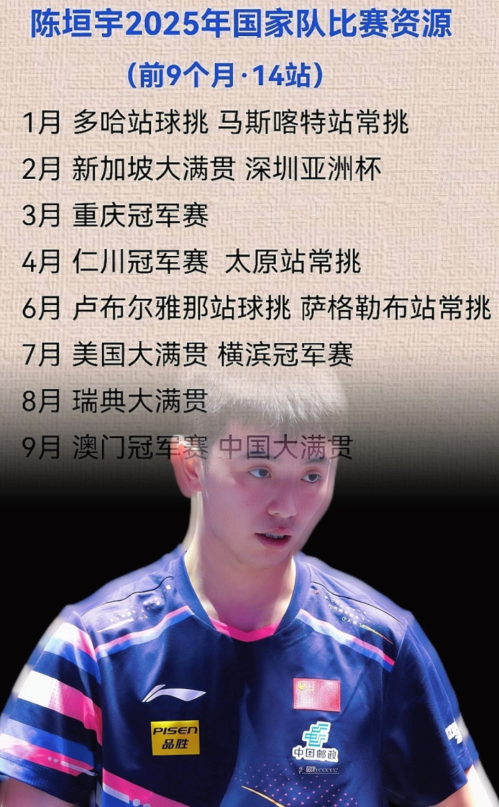 2025年1月至今,陈垣宇已经参加了14站国际比赛,是国乒全队参赛资源最多的球员,没有之一。但是这段灌顶式催生,并没有令陈垣宇产生预期中的蝶变,他在今年打完的几十场比赛中,就只有廖廖个别闪光点,包括战胜张本智和、奥恰洛夫各一次。